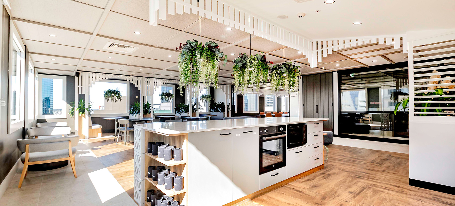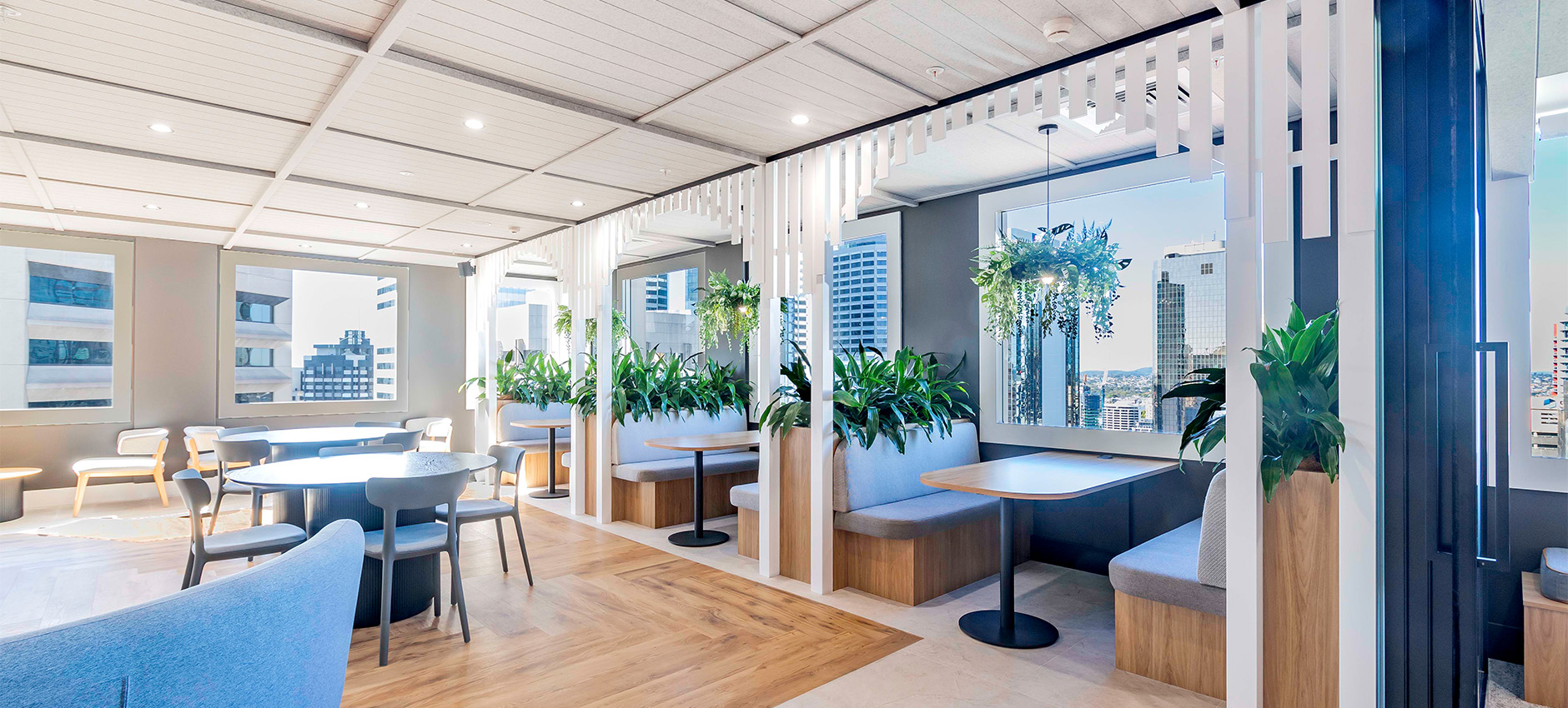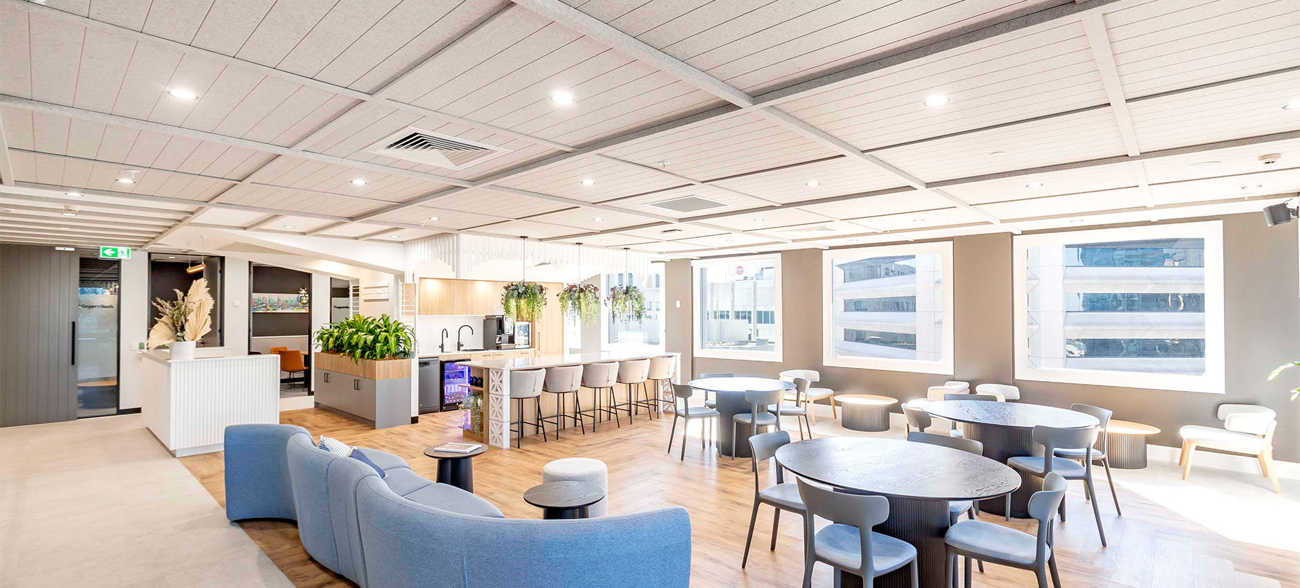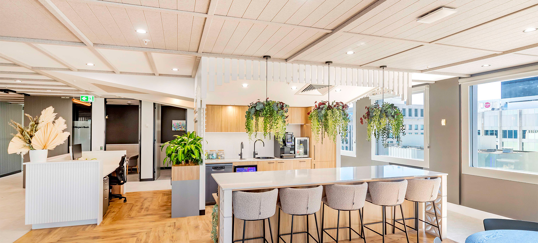 Drawing on familiar residential elements, the space incorporates VJ panelling, light and airy colour palettes, warm timbers, and soft textures, complemented by sleek modern frameworks and lush greenery. Together, these elements create an inviting and refreshing environment that feels both sophisticated and approachable.
